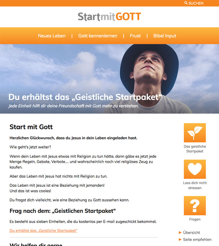 Es gibt noch die Seite: StartMitGott.com. Sie hilft dir in deiner neuen Beziehung zu Gott zu wachsen.